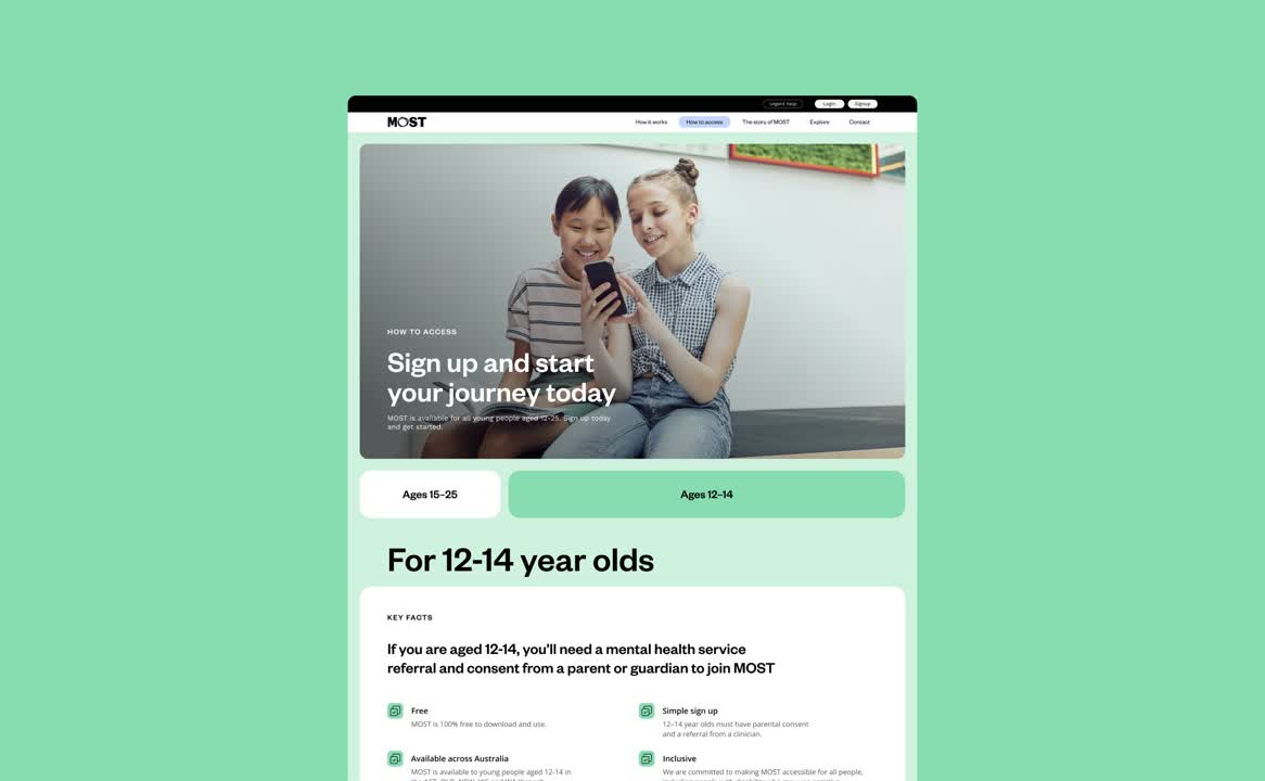 The entire user experience and interface was reimagined from the ground up, optimising the excellent visual identity system our friends at MASS agency had previously created. Built in Webflow, the new site features contemporary UI design, interactive content, and engaging animations that truly bring MOST to life. Most importantly the humanity is dialled up and the product is ready to connect with its audiences. MOST retains its clinical credibility but is now more welcoming, inviting and empowering. The result successfully bridges the gap between therapeutic expertise and the dynamic, youth-centric experience that today's users expect from their mental health tools.